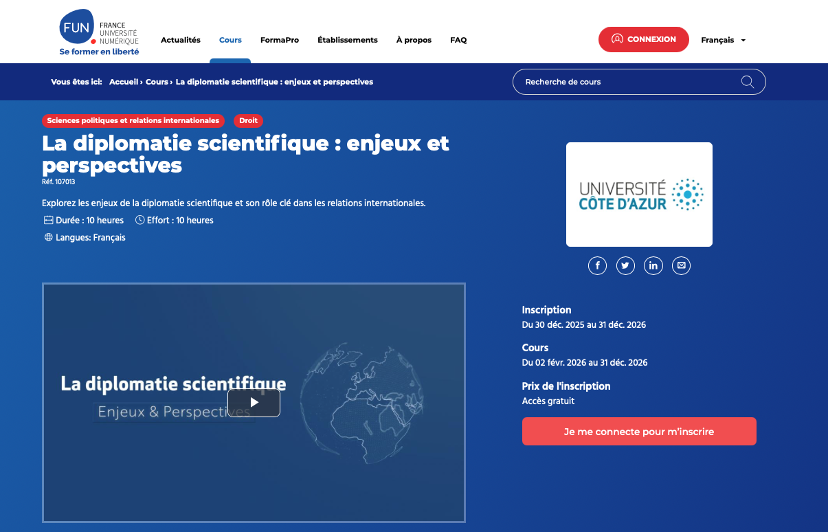 La session (2026) du MOOC "La diplomatie scientifique : enjeux et perspectives" est ouverte.